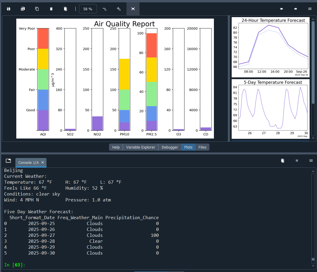 - Data Visualization I worked extensively with the Matplotlib Python library. The 24-hour and 120-hour temperature forecasts used line plots. The Air Quality Report used bar charts to display index and air component levels.
